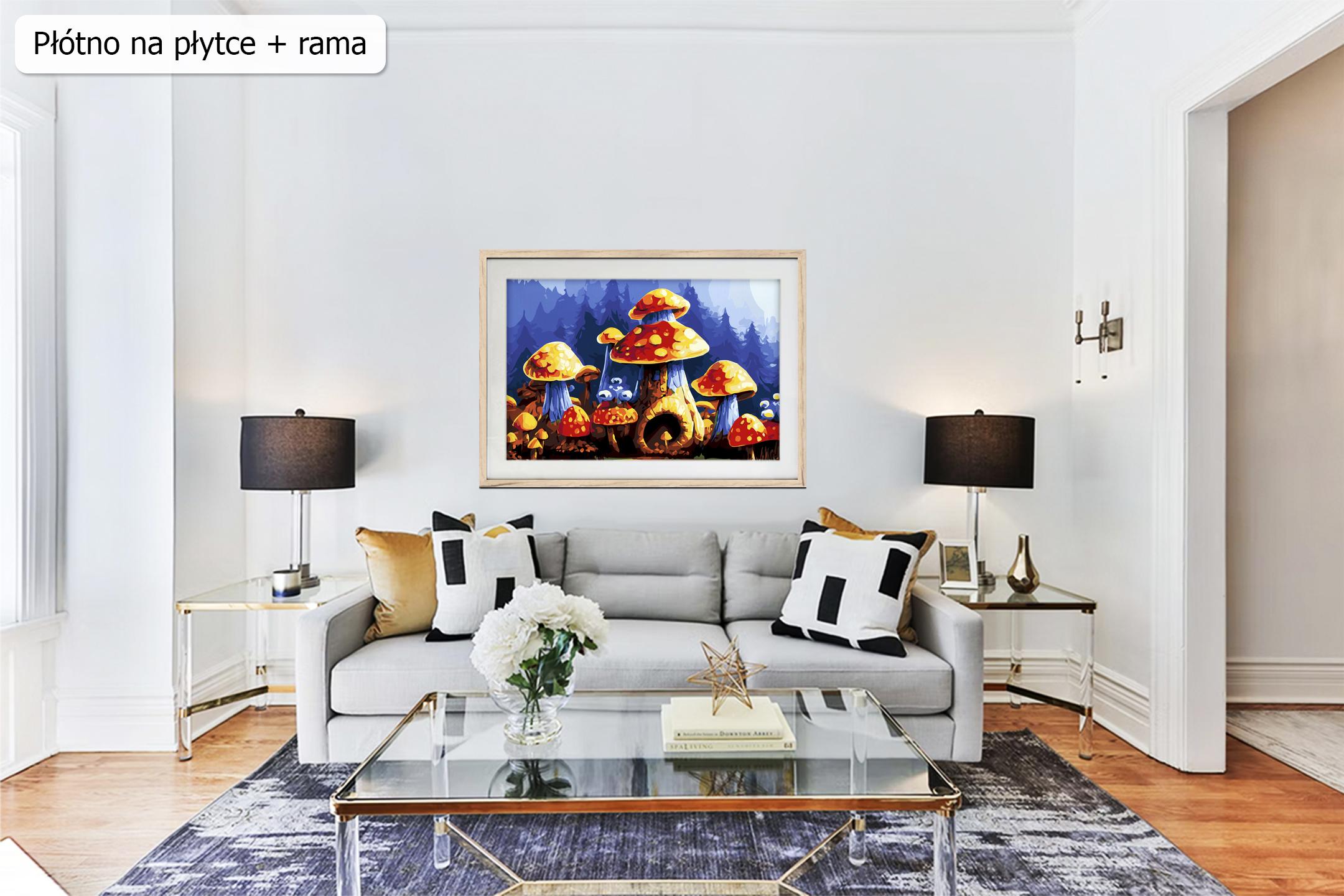 Malowanie po numerach ze sklepu akrylowo, obraz Baśniowe muchomory. Po raz czwarty poddajemy się inspiracji kreskówkami. Tym razem przyszykowaliśmy baśniową krainę z pięknymi muchomorami na średni format naszych malowanych numerami obrazów. Średni, tzn. 40 x 30 cm. Spodziewamy się, że ten motyw będzie uwielbiani przede wszystkim przez najmłodszych. Z tego powodu doradzamy, byście Państwo przynajmniej na początku pracy z obrazem malowali wspólnie z Waszymi pociechami. Obraz jest stosunkowo trudny w wykonaniu, ponieważ zawiera wiele małych obszarów. Co prawda poziom trudności waha się pomiędzy trudnym a średnim, jednak najmłodsi mogą potrzebować wsparcia. Baśniowe muchomory to zestaw, który ma 24 różne kolory oraz dodatkową barwę czarną i białą. Polecamy starszym i młodszym! W tym obrazie zastosowaliśmy cyfry od 0 do 9 i litery alfabetu do oznakowania pól. Dzięki takiemu innowacyjnemu podejściu łatwiej będzie Państwu wykonać dzieło. Polecamy wszystkim pasjonatom malowania po numerach!
