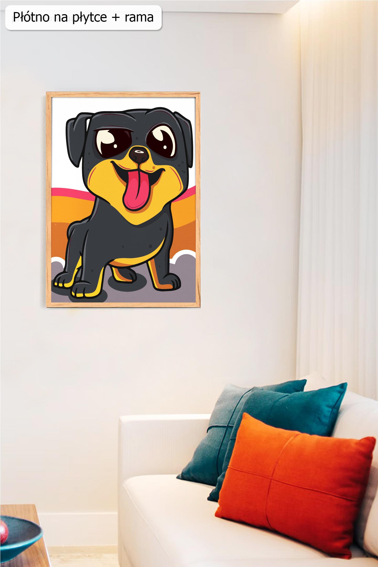 Malowanie po numerach ze sklepu akrylowo, obraz Pies Rumpel. Twój najlepszy kumpel na malowanym numerami obrazie. Akrylowo po raz kolejny wychodzi naprzeciw oczekiwaniom najmłodszych malarzy i oferuje dla nich jeszcze jeden w swojej kolekcji obraz, którego głównym bohaterem jest przyjazny pies. Wzór ten występuje tylko w wersji rozmiarowej średniej, tj. 30 x 40 cm. W zestawie znajduje się 18 różnych kolorów. Obraz jest bardzo prosty w wykonaniu. Śmiało mogą za niego zabrać się dzieci, które nigdy wcześniej nie malowały w ten sposób. Oczywiście najmłodszym trzeba będzie udzielić niezbędnej pomocy. Zachęcamy do zakupu! W tym obrazie zastosowaliśmy cyfry od 0 do 9 i litery alfabetu do oznakowania pól. Dzięki takiemu innowacyjnemu podejściu łatwiej będzie Państwu wykonać dzieło. Polecamy wszystkim pasjonatom malowania po numerach!