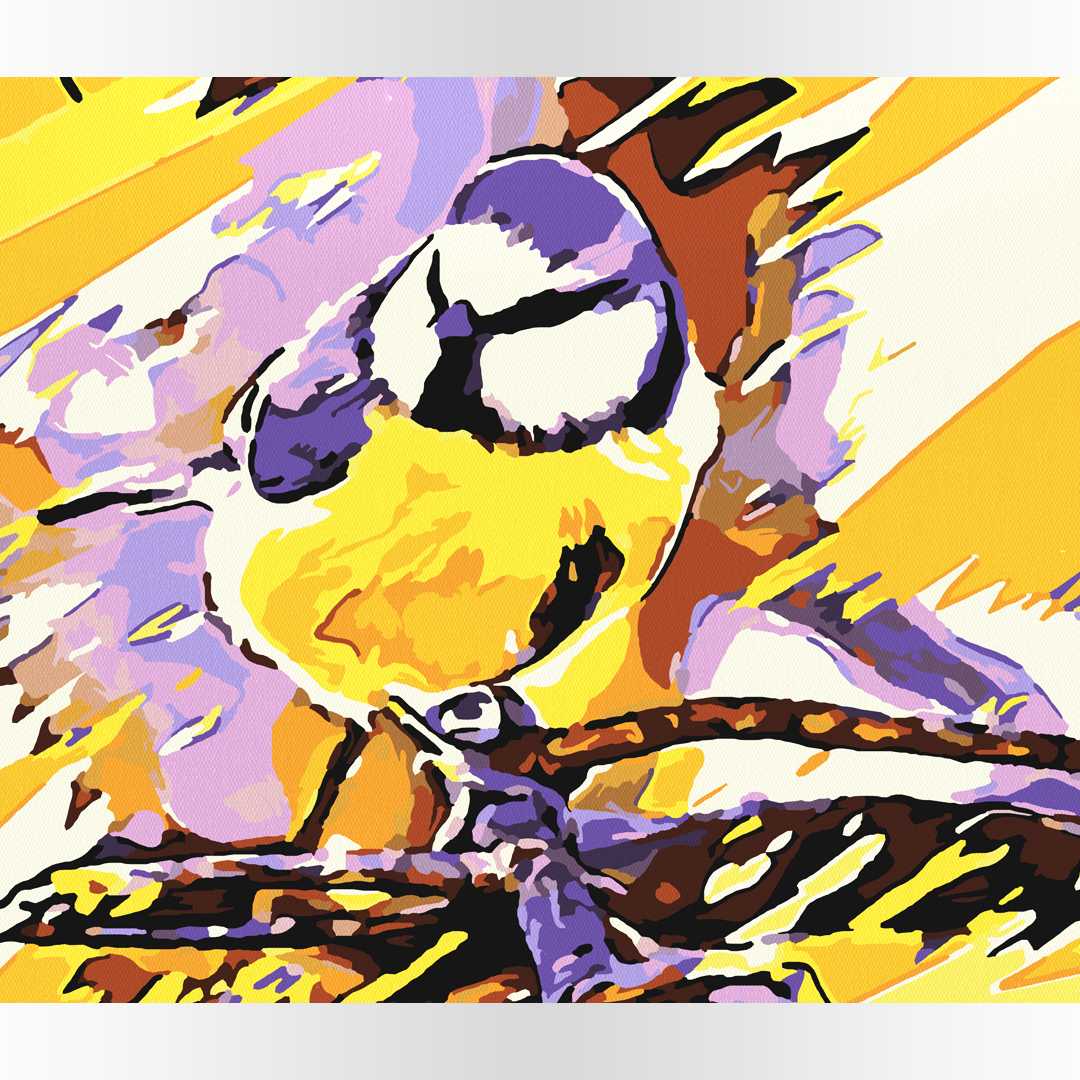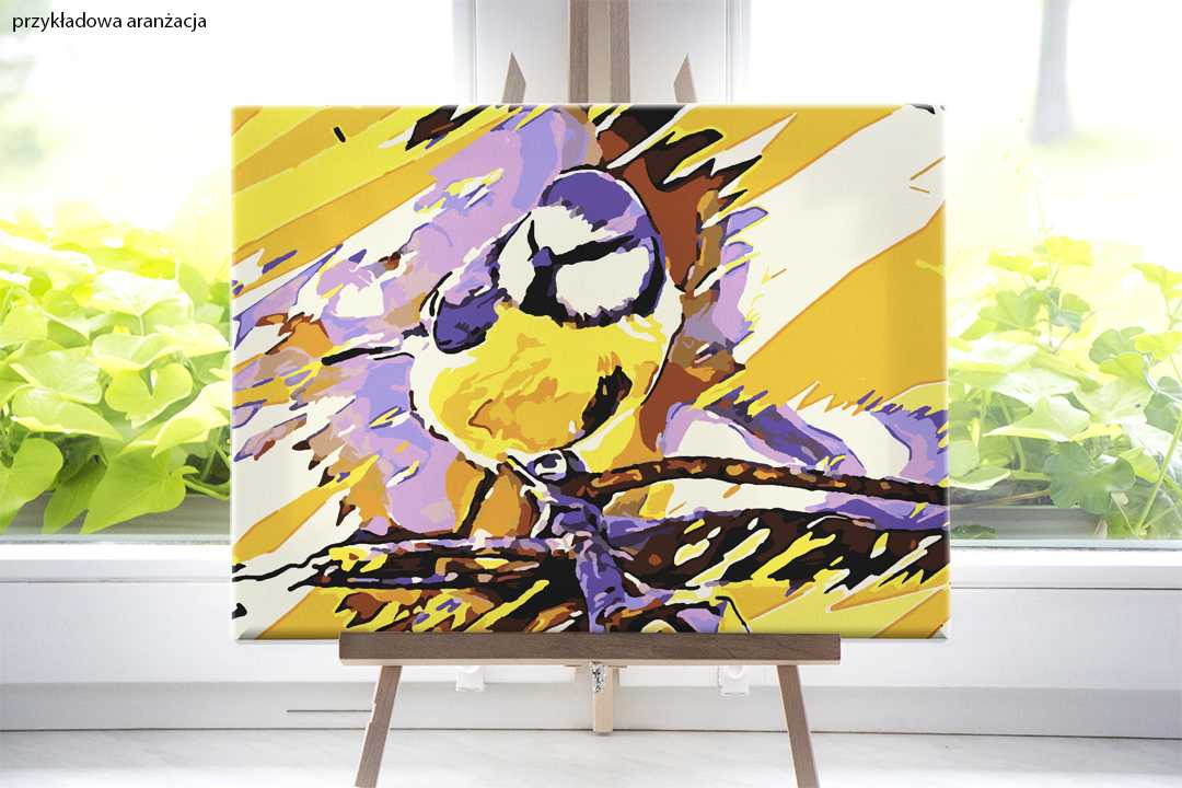 Malowanie po numerach Sikorka, bardzo barwny, ciekawy i utrzymany w niestandardowym podejściu obraz jednego z naszych ulubionych ptaków. Nasz w pełni polski malowany po numerach obraz zafascynuje Cię doborem kolorów. Spójrz tylko jak pięknie grają ze sobą odcienie koloru żółtego, brązowego i fioletowego. Siedzący na gałęzi w centrum obrazu ptak zwraca na siebie uwagę obserwatora. Tło pięknie komponuje się z głównym motywem. Sikorka jest średniego stopnia trudności, choć w wersji większej bliżej jej już do obrazu łatwego, ze względu na większe pola do zamalowania. Polecamy na prezent!