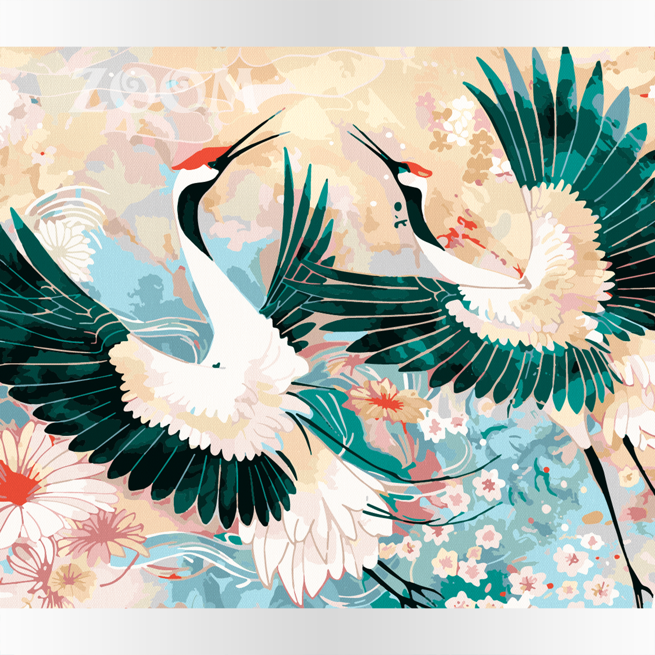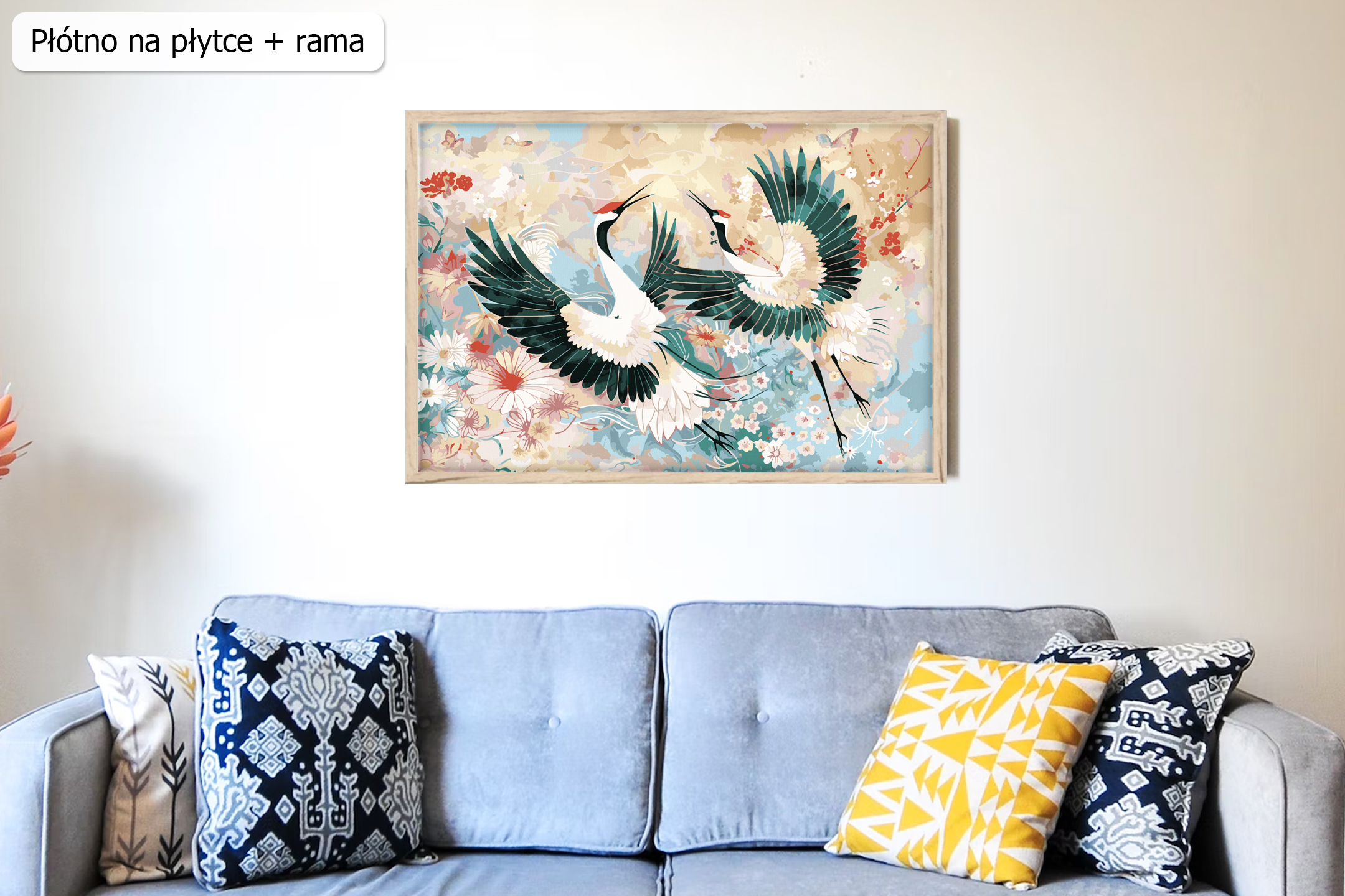 Na obrazie widzimy parę żurawi w trakcie godów, które wznoszą swoje długie szyje, otwierają dzioby, wydając charakterystyczny, głośny trąbiący klangor. Ich sylwetki są wyraziste i dynamiczne, a długie nogi oraz smukłe ciała stanowią kontrast wobec delikatnego tła. Żurawie, z uniesionymi skrzydłami, niemal tańczą, tworząc wrażenie rytmicznego ruchu, a ich ciała są pełne elegancji i majestatu. Tło malowanego po numerach obrazu jest utrzymane w miękkich pastelowych kolorach- odcieniach beżu, turkusu oraz błękitu. Barwy przeplataja się w motywie kwiatów, tworząc spokojną, eteryczną atmosferę. Taki wybór kolorów nie tylko dodaje lekkości całej kompozycji, ale także podkreśla intensywność momentu, w którym żurawie skupiają całą uwagę widza. Ich obecność na pierwszym planie dominuje nad resztą obrazu. Cała scena sprawia wrażenie harmonii jak i głębokiej więzi między tymi wspaniałymi ptakami. Patrząc na ten obraz, można niemal usłyszeć echo ich głośnego klangoru, który odbija się od tła, wypełniając przestrzeń. Sylwetki żurawi tworzą silne poczucie rytmu i natury, jednocześnie ukazując głębię ich tradycyjnego, pełnego wdzięku tańca godowego. Żurawi klangor oferujemy w rozmiarze 60 x 40 na blejtramie, płytce z ramą lub płytce bez ramy. Poziom trudności jest wysoki, a obraz poprzez swoje rozmiary zapewni Państwu długie godziny malowania. Motyw ma 24 różne kolory. Całość wykonano ręcznie w naszej manufakturze z najlepszej jakości materiałów i z użyciem najlepszych technik. Zapraszamy do zakupu. Możecie dokonać go Państwo bez konieczności zakładania konta/logowania się u nas.